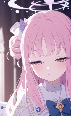 masterpiece,best quality,high quality,loli,1girl,mika (blue archive),solo,pink hair,single side bun,hair bun,long hair,yellow eyes,smile,hair ornament,wings,hair flower,flower,white capelet,white wings,portrait,closed mouth,capelet,purple flower,white dress,dress,half-closed eyes,angel wings,blush,blurry,looking down,feathered wings,<lora:BA3——【Illustrious】hans:0.88>,