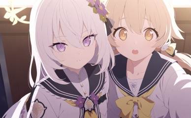 masterpiece,best quality,high quality,loli,hifumi (blue archive), multiple girls, azusa (blue archive), 2girls, halo, hair flower, flower, hair ornament, twintails, open mouth, black sailor collar, long hair, sailor collar, light brown hair, yellow eyes, yellow halo, purple eyes, purple flower, yellow neckerchief, looking at viewer, white cardigan, white hair, teeth, low twintails, school uniform, cardigan, hair between eyes, parted lips, collarbone, ribbon, brown hair, bow, pink eyes, white jacket, upper body, wing hair ornament, neckerchief, jacket, yellow bowtie,<lora:BA3——【Illustrious】hans:0.88>,