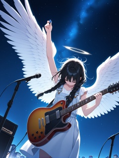 1girl, solo, long hair, black hair, dress, holding, braid, wings, sky, white dress, arm up, night, star \(sky\), feathered wings, instrument, microphone, starry sky, angel wings, white wings, music, angel, guitar, holding instrument, electric guitar, facing down, holding plectrum, Messy hair, crazy hair, Low Angle,Dutch Angle, The overall scene should have a bright and colorful atmosphere, with the main tone being light blue. City Lights Lighting, ,masterpiece,best quality,amazing quality,