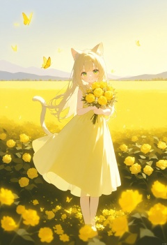 1girl, solo, long hair, green eyes, smile, holding a bouquet of roses, standing in a flower field, soft pastel-colored dress, sunlight filtering through trees, butterflies flying around, pink and yellow flowers, warm golden light, light breeze, cat ears, tail swaying, natural background, open sky, full body, outdoors, summer day