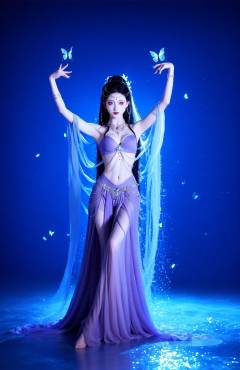 score_9,score_8_up,score_7_up,score_6,this captivating image portrays a figure adorned in traditional Chinese attire amidst a mystical, ethereal setting. Draped in a flowing purple gown with delicate embroidery, the figure exudes elegance and grace. The gown cascades around the figure, creating a sense of movement and fluidity. Intricate details, such as the embroidery and beadwork, are highlighted by the dramatic lighting, which bathes the scene in a soft, ethereal glow. The figure's pose is dynamic, with one arm gracefully lifted, as if caught in a moment of dance or contemplation. The surrounding environment is filled with cobwebs and fluttering butterflies, adding to the magical and enchanting atmosphere of the scene. The use of purple and blue tones imbues the image with a sense of tranquility and depth, further emphasizing the ethereal quality of the composition. Overall, this image is a celebration of traditional Chinese aesthetics and the beauty of movement and light.simple,(blurry background:1.1),blurry,(blurry foreground:1.1),,<lora:xiexinghanfu:0.8>