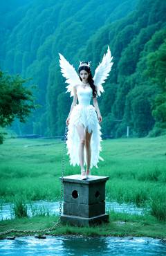 score_9,score_8_up,score_7_up,score_6,this image depicts a surreal scene with a blend of Chinese elements and fantasy. It features a figure in a white dress with delicate, feather-like wings, standing on a pedestal amidst tall, dry grasses. Chains link the pedestal to the figure, creating a sense of entrapment or connection between the two. The backdrop is a serene, natural landscape with a body of water and trees, contrasting with the chains and pedestal, adding to the surrealism of the scene. The white dress and feather wings are reminiscent of traditional Chinese bridal attire and symbolism, suggesting purity and grace juxtaposed with the chains, which could represent obstacles or challenges one may face in life.simple,(blurry background:1.1),blurry,(blurry foreground:1.1),full body,,<lora:xiexinghanfu:0.8>