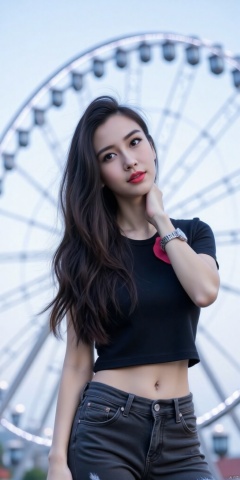 This photograph captures a young woman standing in front of a large Ferris wheel, taken from a low, upward angle. She has light skin and long, black hair that is slightly tousled. She is wearing a black, short-sleeved crop top and high-waisted,part of red bra can be seen, dark-wash skinny jeans with ripped knees, emphasizing a casual, edgy style. Her left hand is lifted, running through her hair, while her right arm hangs by her side. She wears a silver bracelet on her right wrist. The Ferris wheel behind her is illuminated with white lights, creating a contrast against the pale blue sky. The composition follows the rule of thirds, with the woman positioned off-center to the right, leading the viewer's eye up to the Ferris wheel. The lighting is natural, likely from the sun, providing even illumination without harsh shadows. The overall mood of the image is casual and adventurous, capturing a moment of youthful spontaneity.