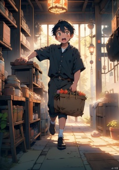 xuanyi,1boy,male focus,open mouth,wide-eyed,shirt,solo,shop,short hair,brown eyes,bag,indoors,looking at viewer,surprised,(((masterpiece))),(((best quality))),((ultra-detailed)),Cinematic,Lighting,