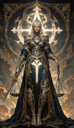 , The scales of justice, symbol of justice, mythology and religion, gods and goddesses, Justitia: The Roman goddess of justice, Justitia was often portrayed wearing a blindfold and holding a sword and scales that were evenly balanced. The scales of justice symbolize the importance of finding a solution that addresses all parties involved, including the guilty, the innocent, and the law itself.,Anime Niji Cyberpunk illustration.