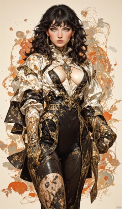 A traditional Japanese ink-on-paper masterpiece blending wabi-sabi aesthetics with a sensual, surreal edge. The artwork features an erotic yet stunning oriental priestess, her delicate face framed by flowing dark hair, bangs, sidelocks. Her captivating green irises glow softly, contrasting against her pale skin, as she gazes seductively at the viewer. Sepia and carmine ink flow harmoniously, She is wearing traditional kimono that slips from her shoulders, revealing deep cleavage. Abstract swirls of henna-hued patterns flow around her form, creating a sense of ethereal movement. Vibrant splashes of surreal colors—a muted crimson, soft gold, and smoky charcoal—enhance the ink composition, giving it life while embracing the imperfections and fluidity of wabi-sabi. The priestess embodies a mystical yet erotic presence, seamlessly merging traditional Japanese beauty with surreal allure,Anime Niji Cyberpunk illustration.,AIDMAFLUXPROULTRA