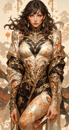 A traditional Japanese ink-on-paper masterpiece blending wabi-sabi aesthetics with a sensual, surreal edge. The artwork features an erotic yet stunning oriental priestess, her delicate face framed by flowing dark hair, bangs, sidelocks. Her captivating green irises glow softly, contrasting against her pale skin, as she gazes seductively at the viewer. Sepia and carmine ink flow harmoniously, She is wearing traditional kimono that slips from her shoulders, revealing deep cleavage. Abstract swirls of henna-hued patterns flow around her form, creating a sense of ethereal movement. Vibrant splashes of surreal colors—a muted crimson, soft gold, and smoky charcoal—enhance the ink composition, giving it life while embracing the imperfections and fluidity of wabi-sabi. The priestess embodies a mystical yet erotic presence, seamlessly merging traditional Japanese beauty with surreal allure,Anime Niji Cyberpunk illustration.,AIDMAFLUXPROULTRA