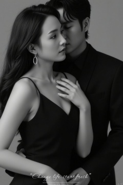 plcp,1man and 1woman,couple,realistic,hetero, This is a black - and - white fashion photography image with two figures, a man and a woman., The woman is wearing a black strapless evening gown. The design of the gown is simple, revealing her shoulders and part of her back, looking elegant and sexy. Her long hair falls naturally, and she is wearing a pair of round earrings, adding a touch of delicacy. One of her hands gently rests on the man's shoulder, with an intimate and natural posture., The man is wearing a black suit with a black shirt inside, and his overall look is simple and formal. His posture appears steady, with his head slightly lowered, corresponding to the woman's posture, creating a harmonious atmosphere., The background of the picture is a simple gray gradient, highlighting the main subjects. Below the picture, there is a text: “Change life.start fresh”, and some smaller English words,jzns