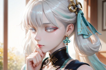1girl, jinhsi \(wuthering waves\), earrings, masterpiece, black collar, black dress, hand up, jewelry, white hair, long hair, white eyes, portrait, colored eyelashes, thinking, backlighting,