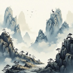 Giant animal, white deer,(elk:1.2), Masterpiece,Best Quality,Abstract, brush stroke, Lushan Mountain,artistic conception of mountains and waters,architectural complex, clouds and mist, cliffs, pine trees, waterfalls, rich lighting, high mountains, minimalism, ultimate details, unparalleled details, Abstract, Surrealism
