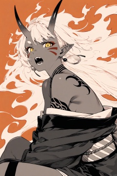 1girl, solo, long hair, looking at viewer, open mouth, simple background, bare shoulders, sitting, monochrome, yellow eyes, earrings, japanese clothes, horns, teeth, pointy ears, kimono, from side, tattoo, facial mark, oni horns, oni, orange background, fiery hair,