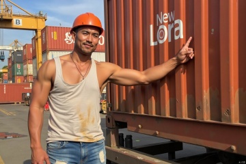 An endomorph Asian docker stands sideways as he points at a container printed with red "New Lora Arrival". He raises head proudly, puckering lips with a mischievous grimace, as he looks at the camera. He wears a sweat-stained white loose singlet, orange helmet, torn jeans, and a silver necklace around his neck, chiseled face framed by square jawline and dark stubbles. In a bustling port bathed in dappled sunlight.,plns,jzns,dnk