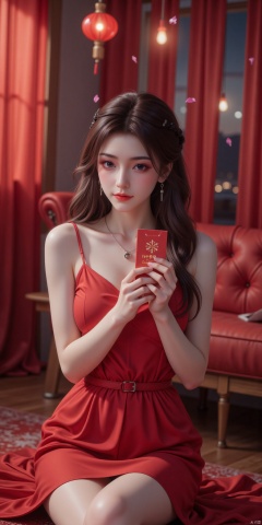 ,(Canon RF85mm f/1.2,best quality,HDR,Realisticity:1.4,(realistic light and shadow):1.5,Cinematic Lighting,the tyndall effect),(1 girl,korean mixed,kpop idol:1.2,beautiful long_Slender_legs,kneeling,holding a little red envelope),(long_brown_wavy_hair),(star shaped pupils,shiny eyes,make-up),(white_shiny_skin,black eyes,Pore,skin texture,shiny),(necklace,earrings,bracelet),(smile):1.2,red sofa,red red,red blanket,red lantern,red neon,(gorgeous,jewelry,earrings,sky,water,necklace,hair bun,wet,petals,random pose,night sky,falling petals):1.5,