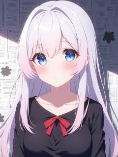 a woman character with white and light pink hair and blue eyes. She wears a black top adorned with red bows,adding a touch of playfulness to her appearance.,