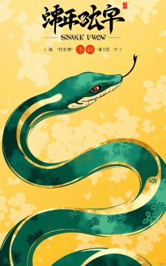 SNHB, a digital poster marking the Snake Year. A cobra of emerald green writhes on a canvas of golden yellow. Its scales shimmer with a metallic finish, echoing the texture of ancient scrolls. The snake's head peeks from the top left, adhering to the rule of thirds. Its eyes are piercing, filled with wisdom. The background fades into a warm blur, emphasizing the cobra's grace. The aesthetic is striking, emerald standing out against yellow. It blends modern digital artistry with traditional painting techniques.