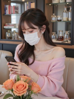 The image is a high-resolution photograph of a young woman sitting in a cozy café. She has long, wavy brown hair tied into a high ponytail with bangs that frame her face. She has a fair complexion and wears subtle makeup, with a focus on her eyes and lips. She wears an off-the-shoulder pink sweater and a white mask, giving her a comfortable, casual feel. The sweater's long sleeves are slightly fluffy, adding a comfortable appeal.