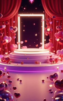 professional 3d model,anime artwork pixar,3d style,good shine,OC rendering,highly detailed,volumetric,dramatic lighting, 3D_style, a round podium on the ground in the middle, Valentine's Day theme, glowing hearts, a door shape frame in the background, dark lighting, beautiful colorful background,very beautiful,masterpiece,best quality,super detail,anime style,key visual,vibrant,studio anime