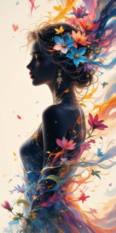 A surrealist illustration of a womans silhouette, full body, with swirls of bright multicolored blacklight ink swirling around her in beautiful colors. flowers in her hair