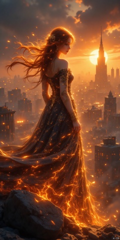 A dramatic portrait of a woman with hair like burning embers,wearing a dress made of fire and shadow,overlooking a burning cityscape at sunset. High resolution,8k,fire lighting,hyperrealistic rendering,detailed textures,burning cityscape,fire,shadow,dramatic,masterpiece.,