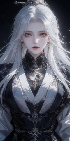 a medium-angle shot of a woman's face features a white face adorned with a black choker adorned with silver embroidery. The woman's hair is long and cascades over her shoulders