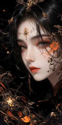 (facepaint,face tattoos), Wet black and orange color inks line art dreamy female portrait with lot of lace filigrees on black canvas illustration described in the perfect fractal style of Vassily Kandinsky, bailing-traditional opera,chinese clothes,(masterpiece, top quality, best quality, official art, beautiful and aesthetic:1.2),1girl