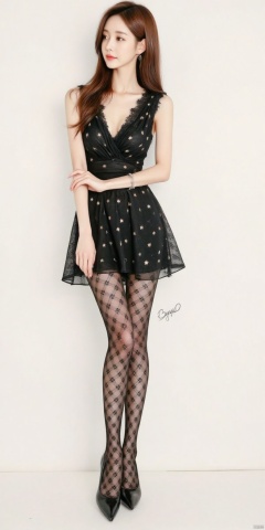 realistic,An illustration of 1girl painted on paper, long hair,asian,pretty,looking away,Confident and lively,black dress, glossy pantyhose,stiletto heels,combining the vibrant colors of watercolor with the elegance of ink wash painting,The art form takes inspiration from the whimsical charm of manga, infusing it with the organic flow of watercolor pigments,Created with brushes and ink, the image showcases the beauty of fluid lines and translucent hues,The focus is on her graceful posture and expressive features, capturing her personality with a combination of delicate ink details and vibrant watercolor washes. The overall image exudes a captivating blend of manga and watercolor aesthetics,argyle legwear,star \(symbol\),
