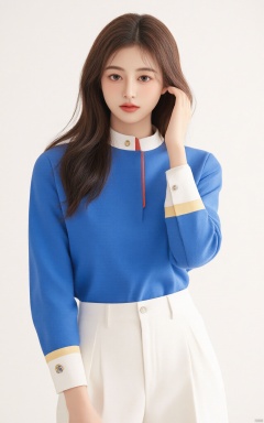 Captured in a low-angle shot, a woman dressed in a white skirt, adorned with a gold belt, stands in front of a stark white wall. The woman's hair is long and cascades down her shoulders, adding a touch of warmth to her outfit. Her eyes are a piercing blue, while her lips are a darker shade of brown. She has long brown hair, and her bangs are pulled back. She is wearing a blue long-sleeved shirt with a red stripe down the left side of her chest. The shirt is adorned with the letter "S" in blue, and the sleeves are adorned with gold bands. She stands with her left hand on her hip. Her left hand is draped over her right shoulder. Her right hand is positioned on her left wrist. Her hair is pulled back in a ponytail, and she has a slight smile on her face.