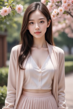 <lora:20250110_Again_Girl_F.1_6:1>,HDR photo, high quality, masterpiece, realistic, photorealistic, ultra high res, highly detailed skin, 1girl, solo, smile, centered shot, from front, face and waist, long hair, look at viewer, cute face, symmetrical body, breasts, perfect anatomy, jacket, pleated skirt, peach blossom, flower petal,