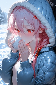 masterpiece,best quality,amazing quality,very aesthetic,absurdres,newest,(yoneyama mai:0.5),(WANKE:0.5),(noyu (noyu23386566):0.5),(aos:0.5),(fajyobore:0.5),(chiaroscuro:0.5),1girl,Yuzuriha Inori,cotton-padded jacket,only showing face and bangs,hooded,thick cotton-padded jacket,heavy snow,heat,blush,