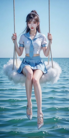 真人肌肤纹理, 4K画质,完美身材,long legs,Film texture, film and television, surrealism, a girl with a delicate face is sitting on a cloud swing. The girl is wearing a jk sailor uniform, a white short-sleeved shirt, light blue stripes trimming, a light blue tie, white blue pleated skirt, exquisite diamond-encrusted high heels, swing rope The sub is connected to a cloud in the sky, the background is a vast ocean, the water shows a consistent blue-green tone, the sky is also blue-green, blending with the ocean, perfect light and shadow, hyper-realistic photography, sharpening, artistic conception, Consciousness, large areas of blank space, sense of space, haziness, dreams, fog,