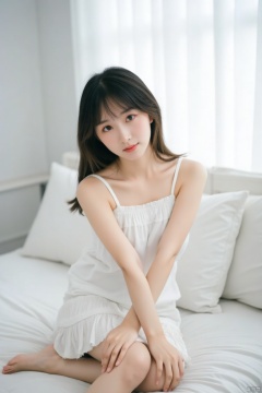 A photo with a sense of atmosphere,a young Asian girl with long dark brown hair and blue eyes is seated on a white bed. She is wearing a white sleeveless shirt with a white ruffled skirt. Her left hand is draped over her right shoulder. Her right hand is resting on her right arm, adding a touch of balance to her body. The backdrop is a stark white wall, with a sheer curtain at the top of the frame