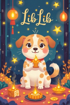 A playful poster featuring a charming scene: A curious dog, with a wispy tail and endearing expression, sits on its haunches, eagerly awaiting a bite of a steaming hot moon cake. The pastry's golden crust glistens under soft, warm lighting, inviting the viewer to take a bite. In elegant calligraphy, the title LibLib is inscribed above the dog, adding a touch of whimsy and sophistication to the design.