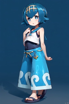 score_9,score_8,score_7, lana \(pokemon\), 1 girl, blue hair, short hair, head band, swimsuit, blue pants, swimsuit under clothes, baggy pants, capri pants, flip-flops,
