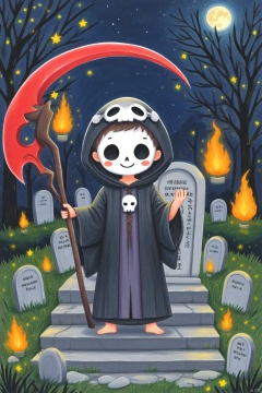 solo, looking at viewer, blush, smile, long sleeves, holding, standing, male focus, outdoors, sky, hood, wide sleeves, star \(symbol\), tree, mask, night, traditional media, blush stickers, moon, grass, fire, night sky, full moon, hood up, skull, robe, stairs, scythe, bare tree, holding scythe, tombstone, graveyard