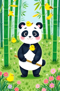 A cartoon drawing of a panda standing on a green grass field. The panda is facing the right side of the image. Its head is facing towards the left. Its eyes are black and round. Its nose is black and its mouth is pink. Its ears are black. To the right of the panda's head is a small yellow bird perched on a bamboo stick. The bamboo sticks are green and have small green leaves on them. There are small pink flowers on the grass in front of the bamboo sticks.