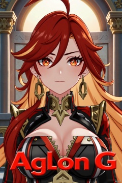 A solo girl with long, multicolored (red and orange) hair, red eyes, and bangs, looking at the viewer with a closed-mouth smile. She wears jewelry, earrings, and small breast armor with pauldrons. Her upper body is in focus, with a strand of hair between her eyes. The scene is framed as a movie poster with a dynamic composition, featuring a pillar, column, and throne in the background. Cinematic lighting creates high contrast and a dramatic atmosphere. The text AGlong is displayed in three-dimensional style below her. The background is detailed and poster-themed, with sharp focus on the subject.