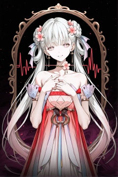 horror \(theme\),picture frame,glitch,background of eyes,abstract,(disembodied_eye:1.3),upper body 1girl,yandere,smile,(cardiogram:1.2),hand on chest,grabbing own chest,hmmonitoring,twintails,(dark:1.1),darkness,black,surreal,multicolor,iridescent,(square panel:0.65),(corner pattern:0.75),spotlight,(tidsean:0.9),(misyune:1.1),wanke,(reoen:0.9),(rei \(sanbonzakura\):0.9),suihei sen,tekito midori,<lora:jxnew-noob-Tanger-000014:0.8>,jinhsi,jinhsi \(peach blossom\) \(wuthering waves\),(clothes:peach blossom pink dress,alternate costume,bare shoulders:1.2),flower-shaped pupils,1girl,hair ornament,hair flower,twintails,bangs,jewelry,very long hair,