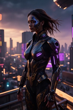 A mesmerizing cybernetic woman with flowing black hair streaked with shimmering gold highlights, her piercing violet eyes radiating an otherworldly glow. Her advanced armor combines matte black and deep purple tones with golden circuit-like patterns running across its sleek surface, creating a striking, futuristic aesthetic. The armor is adorned with sharp, angular designs, glowing violet energy nodes, and intricate engravings that pulse faintly with light. She wields a slender, glowing blade on her back, and her mechanical arms feature delicate golden tracery that hints at immense power. Behind her stretches a sprawling futuristic city illuminated by golden and violet neon lights, with floating platforms, towering spires, and shimmering energy fields. Standing atop a glowing energy platform, she gazes into the distance, exuding an aura of authority and elegance. Hyper-detailed, photorealistic, cinematic lighting, 8k, a perfect blend of elegance and cybernetic power.
