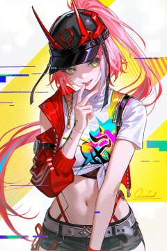 8k,best quality,masterpiece,(ultra-detailed),(high detailed skin),artist:john kafka,(artist:wanke:0.9),artist:fuzichoco,artist:quasarcake,(artist:nixeu:0.8),(1girl:1.2),upper body,light grin,chromatic aberration,cyberpunk,licking finger,glitch lump on face,lens_flare,colorful,chromatic aberration,dynamic pov,Chromatic Aberration,Glitch lettering,abstract art,(clear lines:1.1),(squares:1.1),bright,limited palette,canonical composition,(neat diagonal striped background:1.2),(Light Yellow background:1.1),ultra-detailed,film grain,geometry stripe,genderswap,<lora:rappa-noob-Tanger-000011:0.8>,rappa,def-rappa clothes,baseball cap,1girl,green eyes,shorts,navel,midriff,pink hair,horns,belt,multicolored hair,shirt,