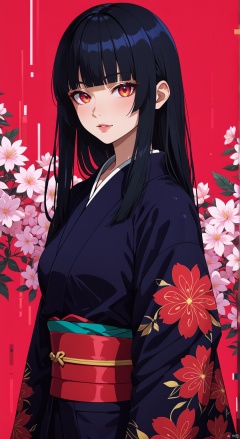 1girl, solo, long hair, kimono, japanese clothes, red eyes, bangs, black hair, blunt bangs, hime cut, looking at viewer, bracelet, floral print, jewelry, red background