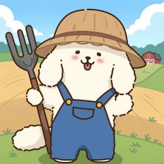 SDTX, Farmer avatar, depicting a white anthropomorphic poodle in overalls and straw hat, holding a pitchfork. The backdrop is a bucolic countryside, with rolling fields and a red barn.