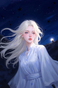 A digital painting of a woman with long blonde hair. She is wearing a white long sleeved dress. The dress is white with blue designs on it. The woman's hair is blowing in the wind. Behind her is a dark blue sky with a light shining on the right side of the image. There are black stars in the sky.