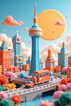 Felt style, furry Canton Tower, furry subway train, furry sun, Guangzhou, clean image, clean background, depth of field, felt painting, wool felt, bright colors, whimsical, fluffy, stop motion animation, miniature landscape,