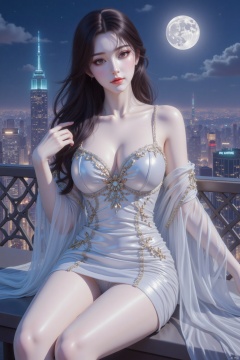 plns,hlr,hlr_dress,This is a CG - style illustration depicting a female character adorned in magnificent clothing. flesh-colored pantyhose.She has long, jet - black hair and a delicate face. Her attire features a metallic sheen and is decorated with exquisite patterns, paired with transparent floating veils, embodying a combination of classic and modern elements. The background is a bustling city night scene, with a bright moon hanging high in the sky, creating a dreamy and romantic atmosphere., sitting,up_skirt, looking at viewer, CG,