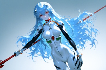 (artist:quasarcake:0.3),1girl,plugsuit,solo,long hair,ayanami rei,white bodysuit,red eyes,breasts,blue hair,bodysuit,holding,looking at viewer,weapon,interface headset,medium breasts,hair between eyes,polearm,alternate hair length,cowboy shot,skin tight,floating hair,gradient,holding weapon,gradient background,alternate hairstyle,bangs,holding polearm,standing,very long hair,breasts apart,extreme aesthetic,(quasarcake:0.7),masterpiece,best quality,good quality,newest,year 2024,year 2023,very aesthetic,absurdres,Visual impact,A shot with tension,(Visual impact:1.2),dutch angle,