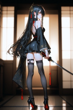 1girl,solo,long hair,breasts,looking at viewer,bangs,black hair,hair ornament,thighhighs,dress,holding,bare shoulders,very long hair,closed mouth,standing,full body,yellow eyes,weapon,looking back,sword,black thighhighs,wide sleeves,from behind,black footwear,holding weapon,black dress,high heels,thigh strap,short dress,katana,masterpiece,best quality,high quality,overexposure,chromatic_aberration,light,fair_skin,very aesthetic,absurdres,newest,masterpiece,safe,amazing quality,(aestivation:0.4),(nasii:0.4),(toosaka asagi:0.4),(atdan:0.4),(artist:quasarcake:0.8),(iumu:0.72),(wlop:0.72),96YOTTEA,Konya Karasue,//,depth of field,detailed light,blurry background,best shadow,shiny skin,cinematic lighting,ray tracing,amazing quality,very aesthetic,absurdres,beast quality,ultra detailed,newest,8K,HDR,