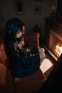 masterpiece,best quality,amazing quality,very aesthetic,absurdres,newest,extreme aesthetic,in the style of fashion photography,light particles,cinematic lighting,Visual impact,sharp focus,Emotionalization,depth of field,dutch angle,scenery,1girl,gui_zhong,Gothic Lolita skirt,sitting on the sofa,looking down on the corner,evil smile,hands,from_above,from_side,fireplace,fire against the girl,perfect light and shadow,complex shadows,ray tracing,