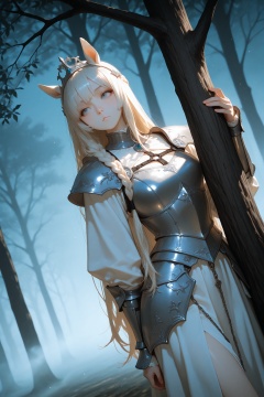 masterpiece,best quality,amazing quality,very aesthetic,absurdres,newest,extreme aesthetic,in the style of fashion photography,light particles,cinematic lighting,Visual impact,sharp focus,Emotionalization,depth of field,dutch angle,scenery,muted color, realistic, depth of field, 1woman, armored dress, fog, dusk wood, leaning on a oak tree, a lone white horse, braided very long hair, :/,