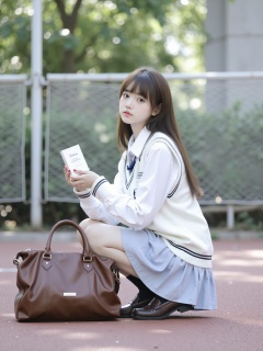 The photograph depicts a young Asian woman, likely in her early twenties, kneeling on a reddish-brown rubberized surface, possibly a tennis court. She has long, straight brown hair with bangs, and her facial features are delicate, with a small nose and full lips. She is wearing a white long-sleeve shirt with a fitted, sleeveless white vest, and a light blue pleated skirt. Her attire gives her a schoolgirl appearance. She holds a white box with blue text in her right hand, and her left hand is resting on her knee. She is wearing black socks and dark brown loafers. In the background, there is a white mesh fence and green foliage, suggesting an outdoor setting, possibly a school or park. A large brown leather handbag with silver hardware lies beside her on the ground, adding to the casual, everyday setting. The overall image is well-lit, with natural light filtering through the foliage, creating a soft, diffused glow. The composition is balanced, with the subject centered and the background slightly blurred, drawing focus to her. The textures of her clothing and the bag are smooth and polished, contrasting with the rough, textured surface of the ground.<lora:YY-浅浅F.1:1>,