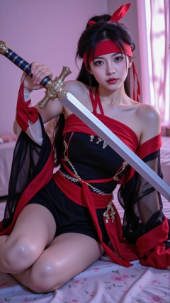 The image shows a young woman sitting on a bed with a large sword in her hand. She is wearing a red and black outfit with a red headband and a red ribbon tied around her head. The sword has a silver blade and a blue handle. The woman is holding the sword with both hands and is looking directly at the camera with a serious expression on her face. The bed has a white comforter with a floral pattern and there is a window with pink curtains in the background. The overall mood of the image is dark and mysterious.